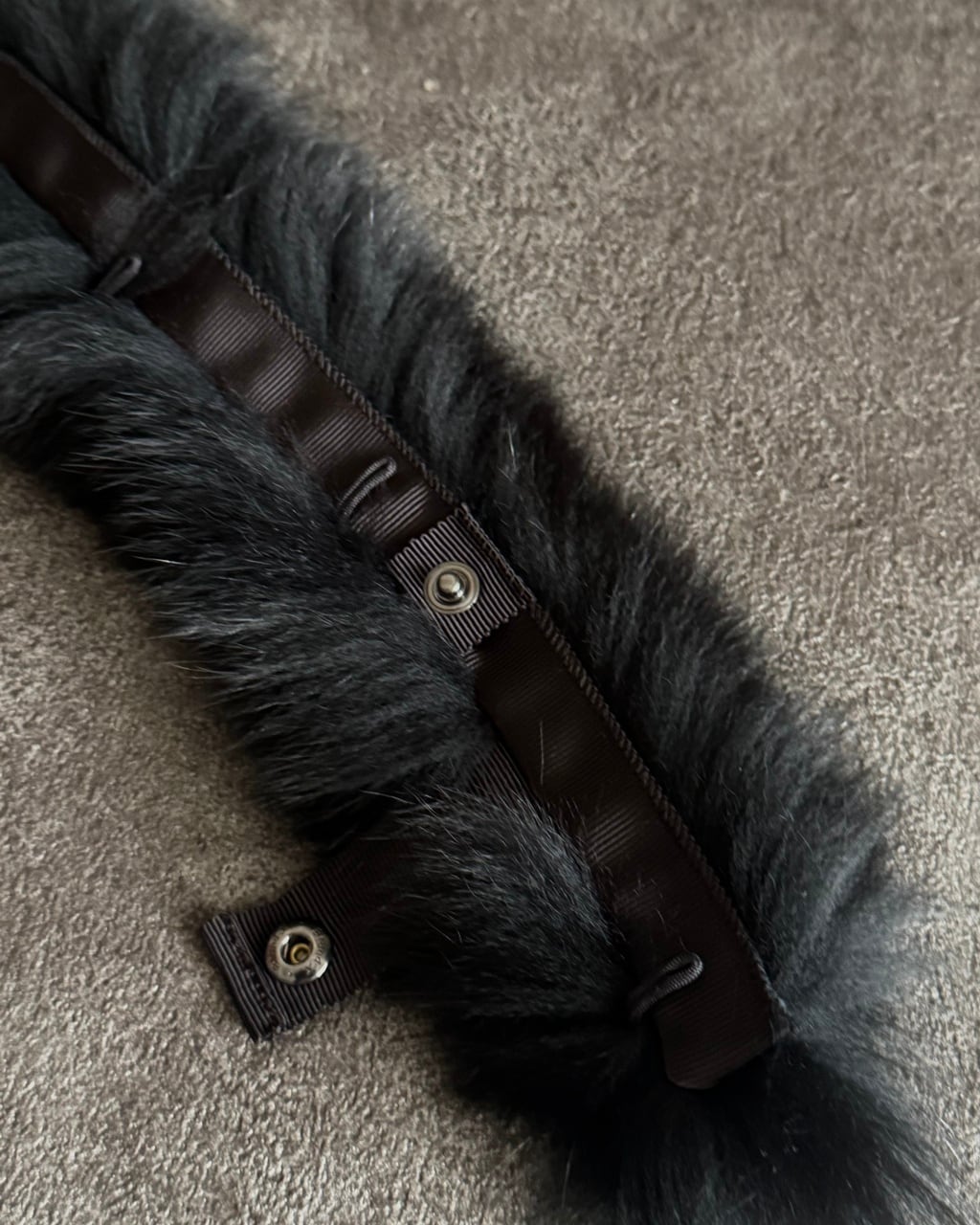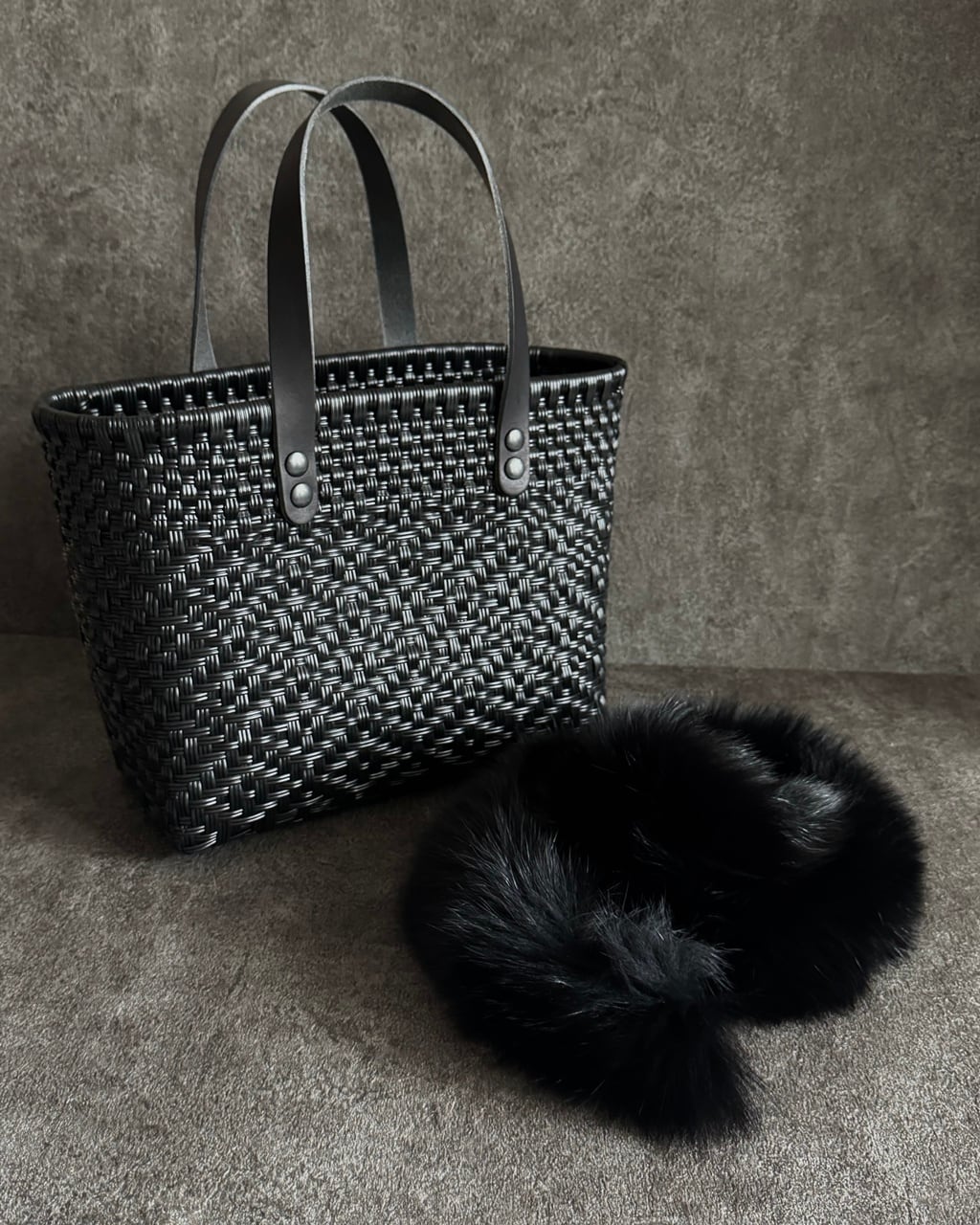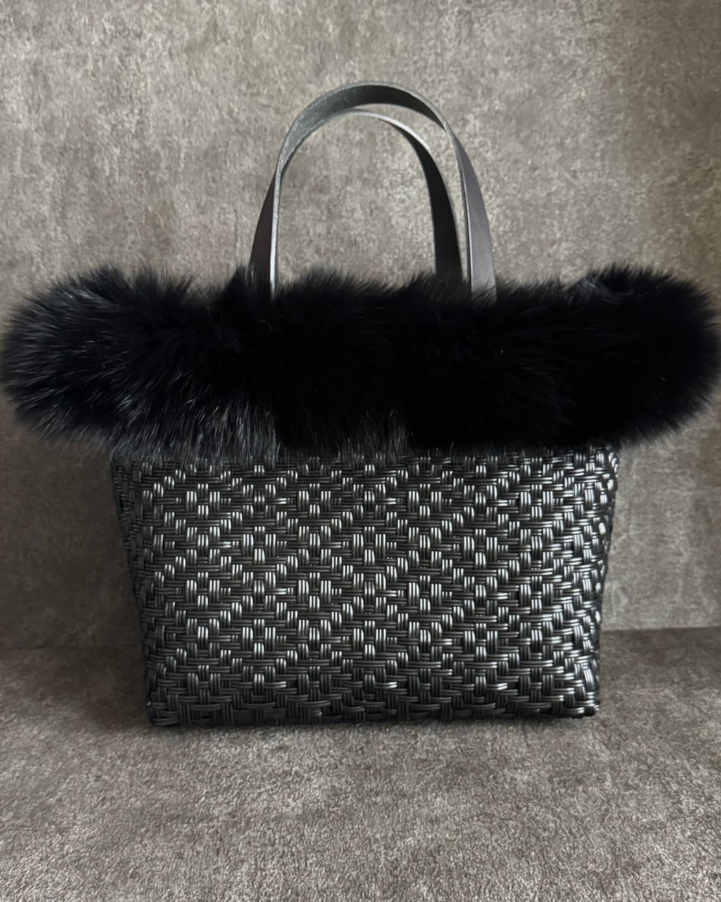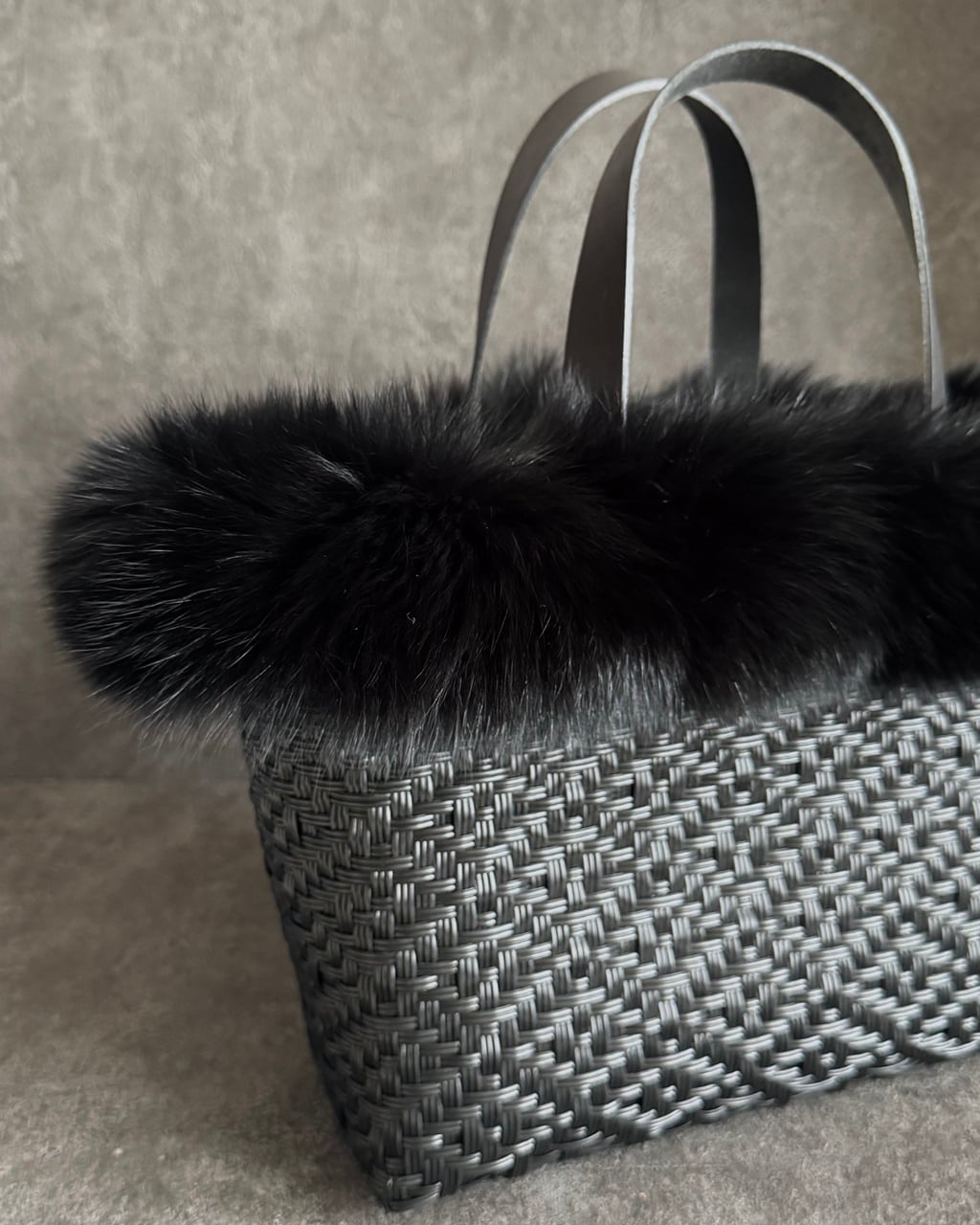 バッグファーはイタリア製フォックスを使用。フワフワで柔らかく滑らかな肌触り。ハンドルの対角線上に2ヶ所にスナップボタン、そして縁部分に引っ掛ける複数のフックで簡単に固定できるので、急な雨でもすぐに取り外しできます。
