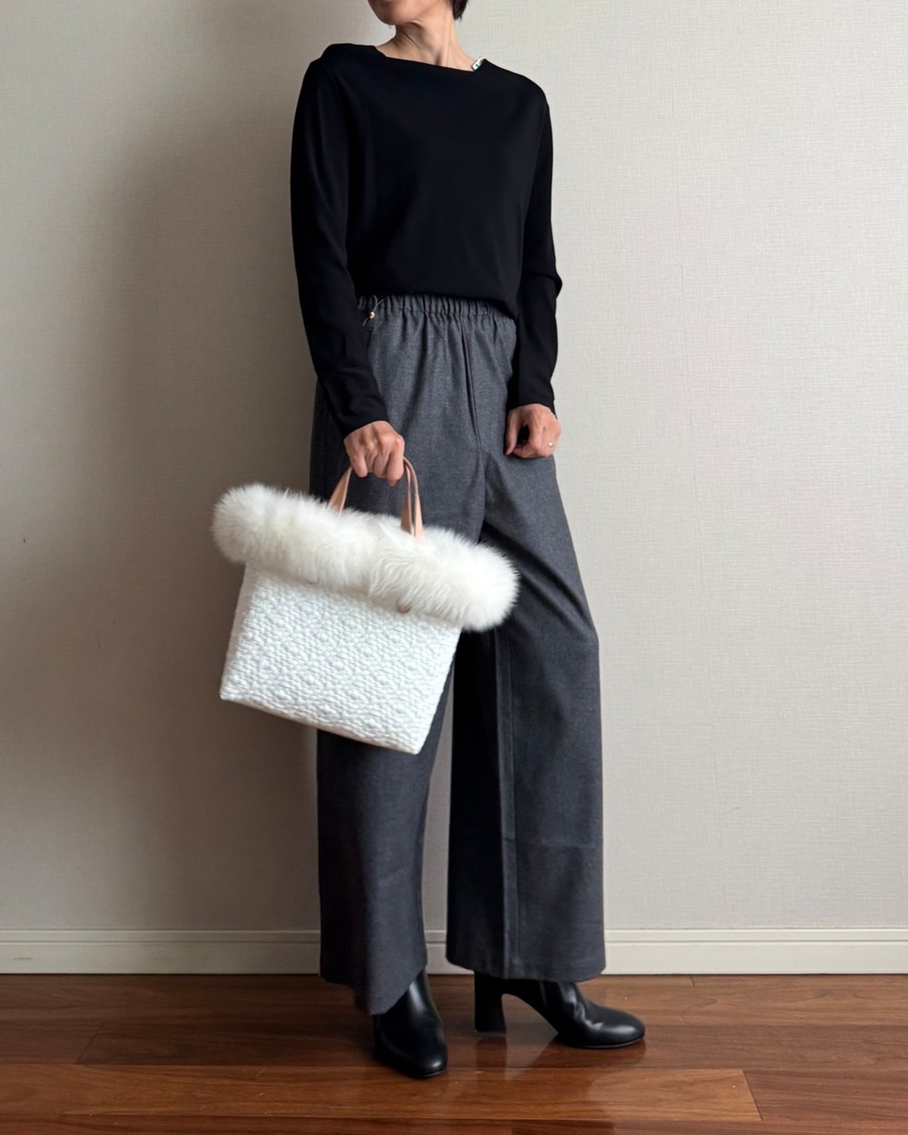 シンプルなデザインですが、バッグファーを付けるだけで一気に華やかに。